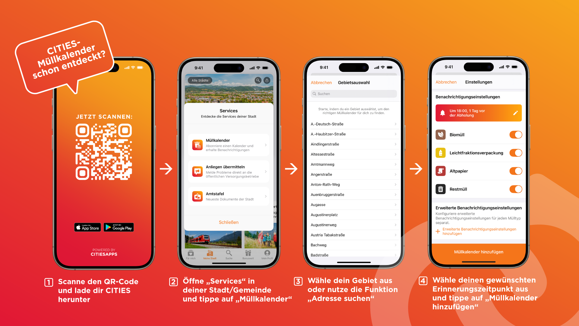 Tippe im Tab “Meine Stadt” auf “Services” und wähle “Müllkalender”.